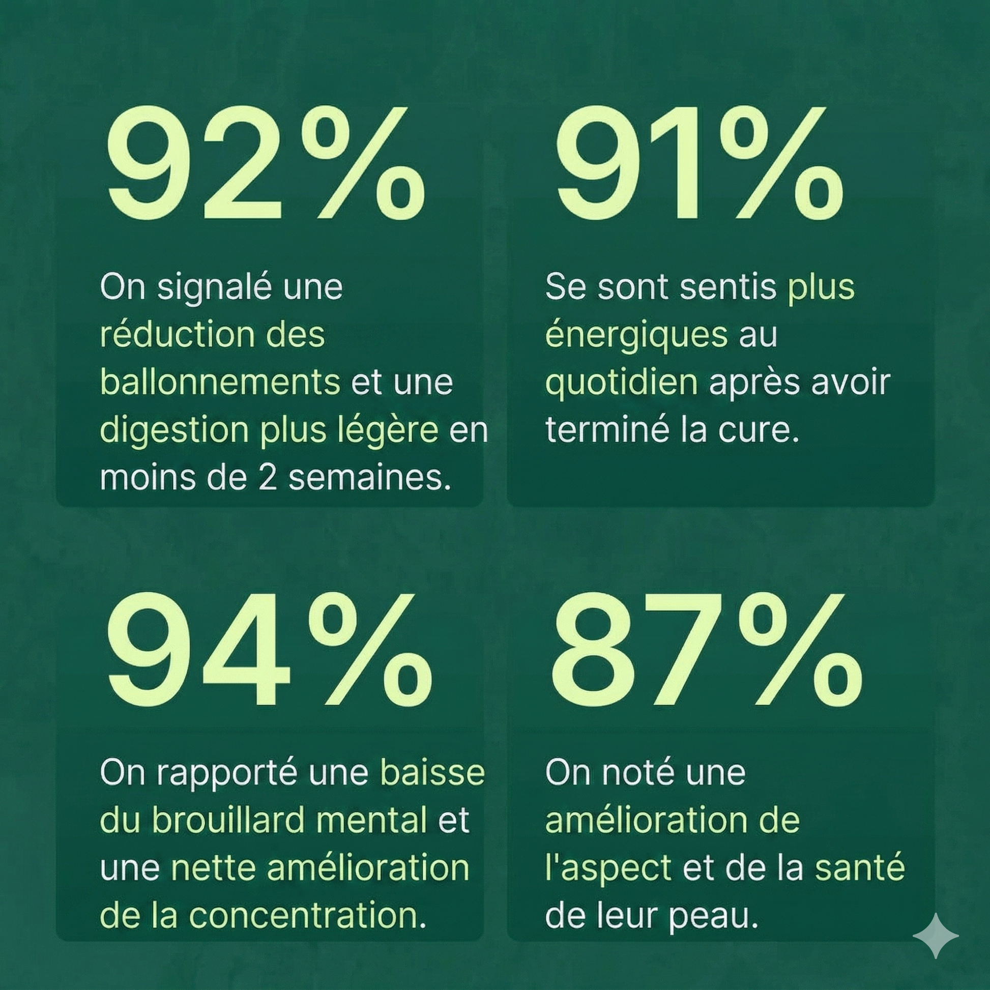 De nombreux utilisateurs rapportent se sentir plus légers, avoir moins de ballonnements et plus d'énergie dès les une à deux premières semaines. Les résultats varient d'une personne à l'autre ; une utilisation régulière est essentielle.