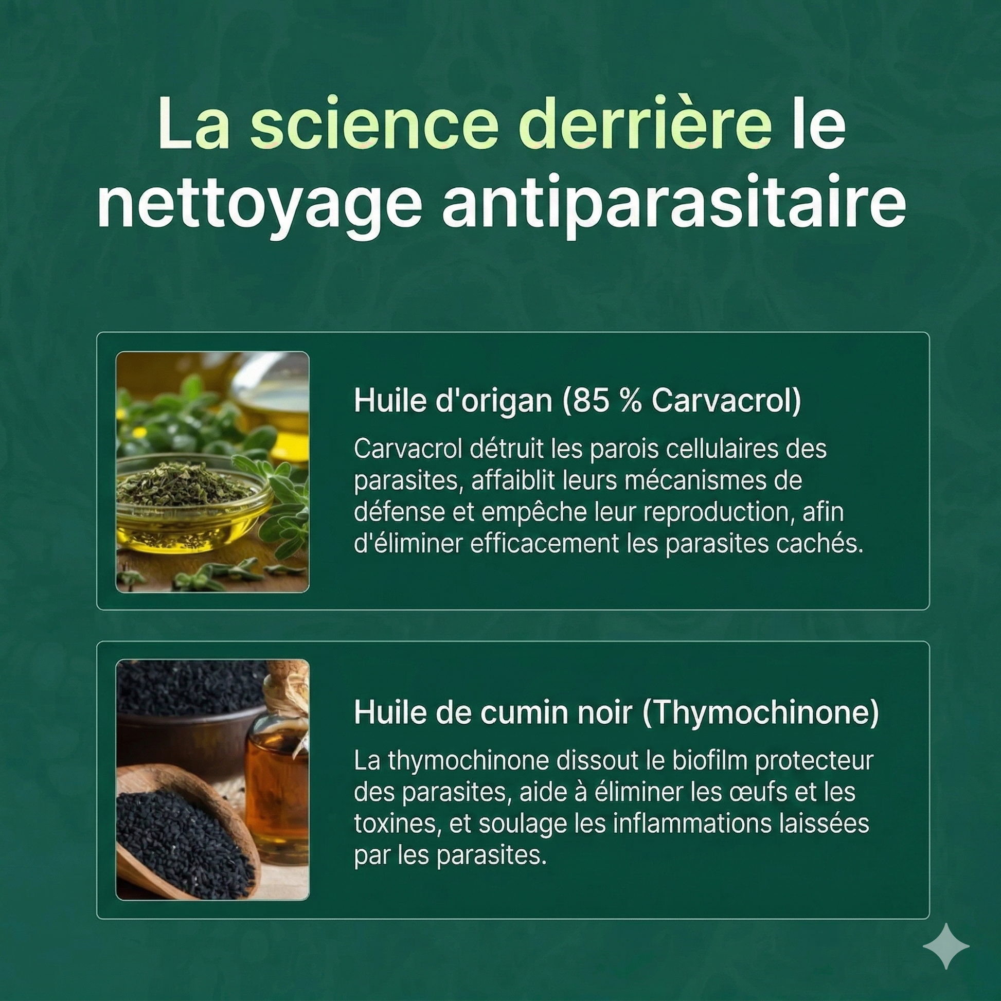 Le carvacrol détruit les parois cellulaires des parasites, affaiblit leurs mécanismes de défense et empêche leur multiplication, ce qui permet d'éliminer les parasites cachés dans l'organisme.