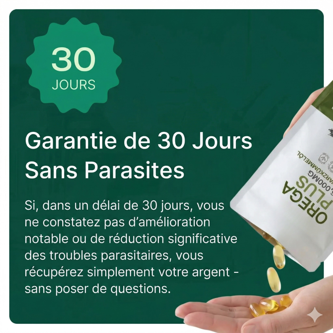Si, dans les 30 jours, tu ne constates aucune amélioration notable ou aucune diminution significative des symptômes parasitaires, tu peux simplement renvoyer ta commande et tu seras intégralement remboursé, sans aucune condition.